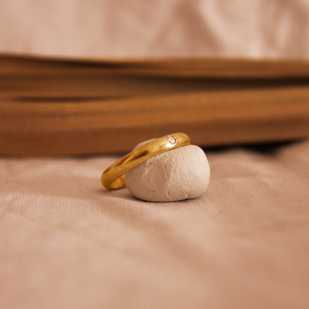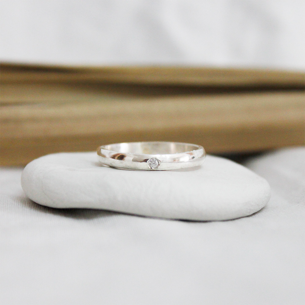 Unas alianzas clásicas con diamante engastado. Estas alianzas son de sección de media caña y llevan una pequeña piedra preciosa en su parte superior.